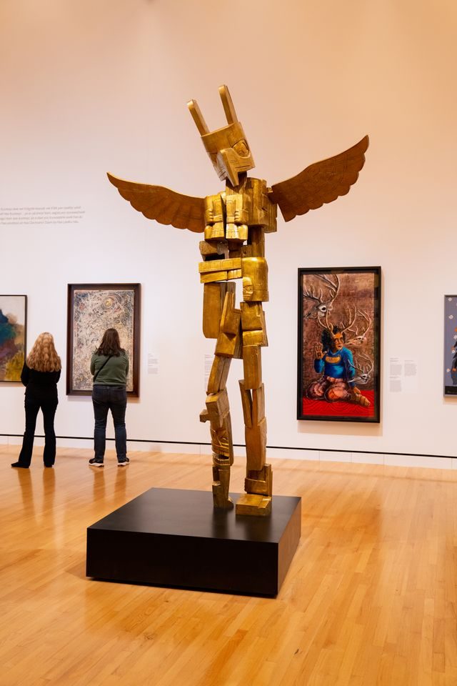 Among the regional artists newly represented in the collection is Addie Roanhorse’s Eldest Daughter (2025), which reflects her practice of highlighting intergenerational strength and contemporary Osage matriarchy. Kelly Church, a fifth-generation basket maker, brings deep material knowledge to Sustaining Traditions: Basket of Resilience (2024), continuing her work revitalizing ancestral black ash weaving traditions while emphasizing the protection of natural resources central to Indigenous life. Cherokee Nation artist Jane Osti’s 2024 ceramic vessels, including The Abundance, A Sacred Fire, and Spirit of Survival, draw upon storytelling traditions to explore place, ceremony, and the enduring relationship between land and community.